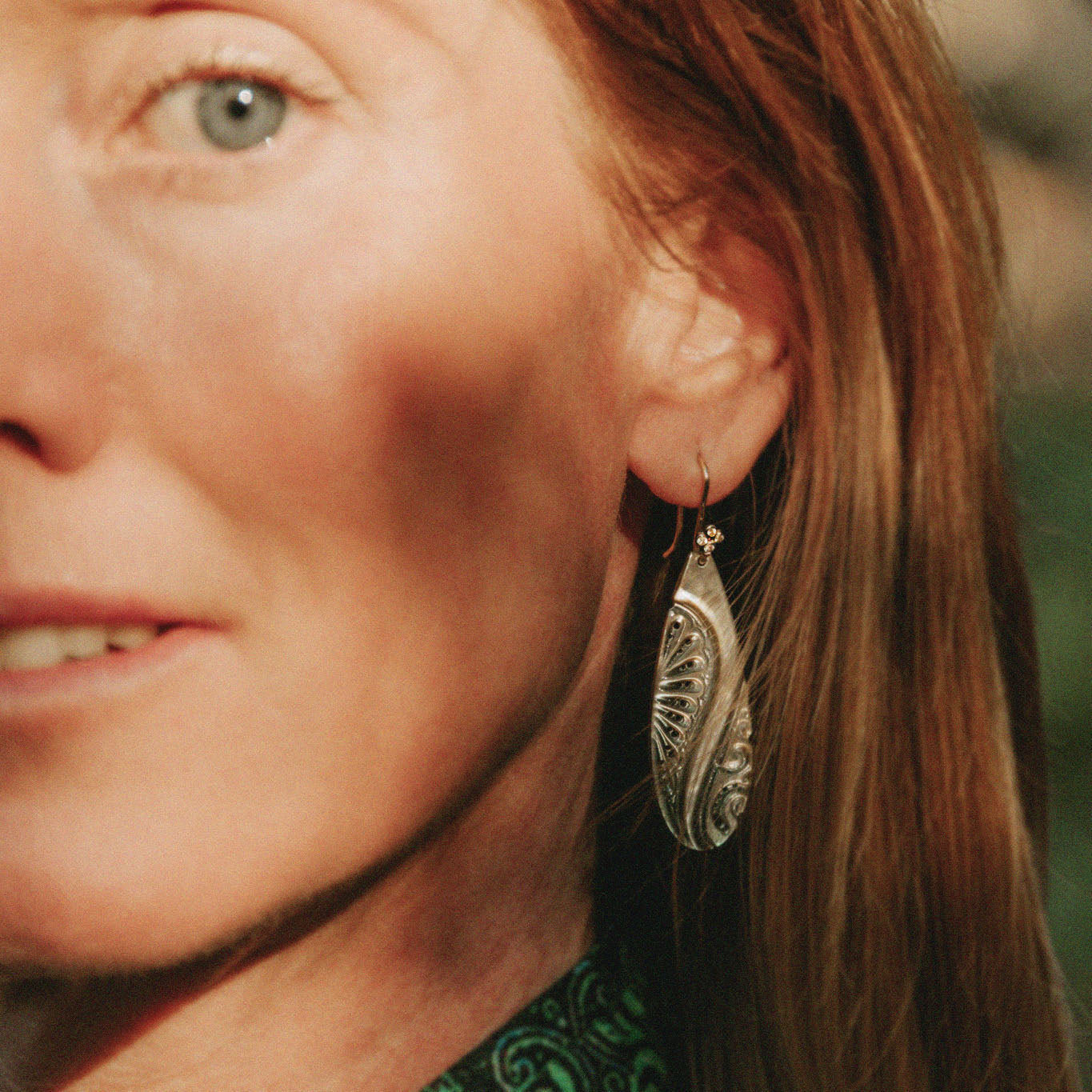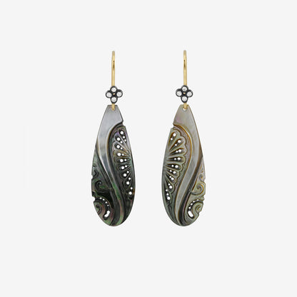 Mother of pearl shell from the black lip oyster is carved by artisans in Tahiti using designs from traditional Polynesian tattoos. Hanging on 18 karat yellow gold ear hooks set with ocean diamonds.